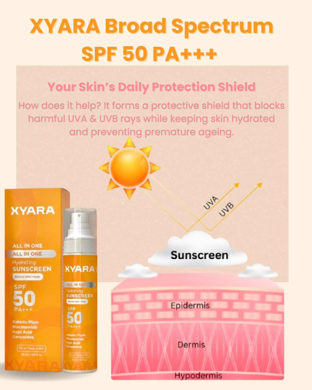 Designed for everyday defense, Xyara SPF 50 PA+++ sunscreen safeguards your skin from harsh sun exposure while maintaining moisture balance. Its advanced broad-spectrum formula protects, nourishes, and keeps your skin fresh without greasy residue.